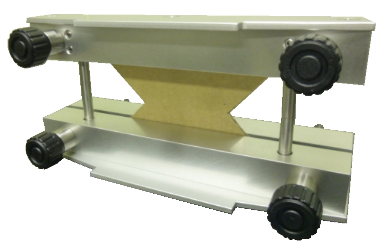 This tester measures the vertical compression strength of a corrugated board sheet, and is also referred to as an end crush tester. A corrugated board sheet is erected straight and load is applied on it. As the load increases, the maximum load is measured that is reached before the side surfaces of the corrugated board sheet is buckled. The strength perpendicular to the corrugated section is a characteristic value correlated to the pressure-withstanding capacity of the corrugated board case and also has a correlation with the ring crush characteristic of the raw paper. Measurement is performed on a specimen collected with a cutter for end crush tests (No. 2134) that is set into a crush tester along with this attachment.