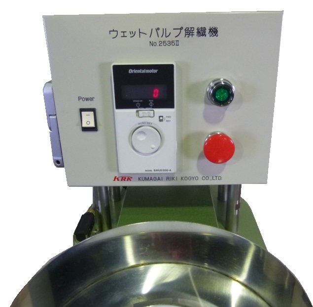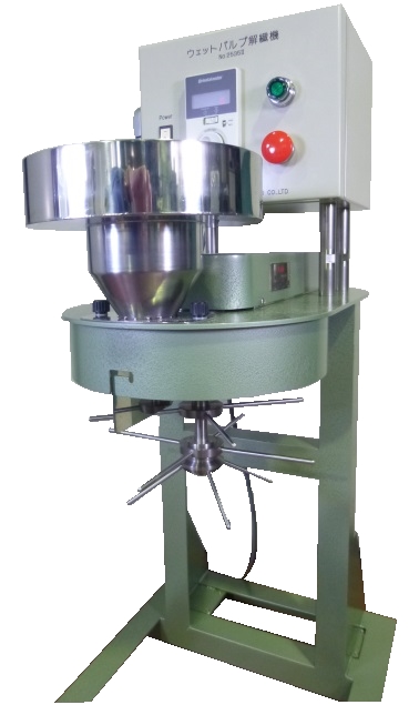 This machine has been developed for rapidly disintegrating wet pulp (concentration 20 to 30%). Machine configuration: the material is charged into special agitating impellers that rotate at a high speed; then the pulp is disintegrated at an instant and discharged from the lower port. Both dry pulp and wet pulp can be processed, remaining less grains. Since the specimen tank can be removed, efficient measurement can be made.
