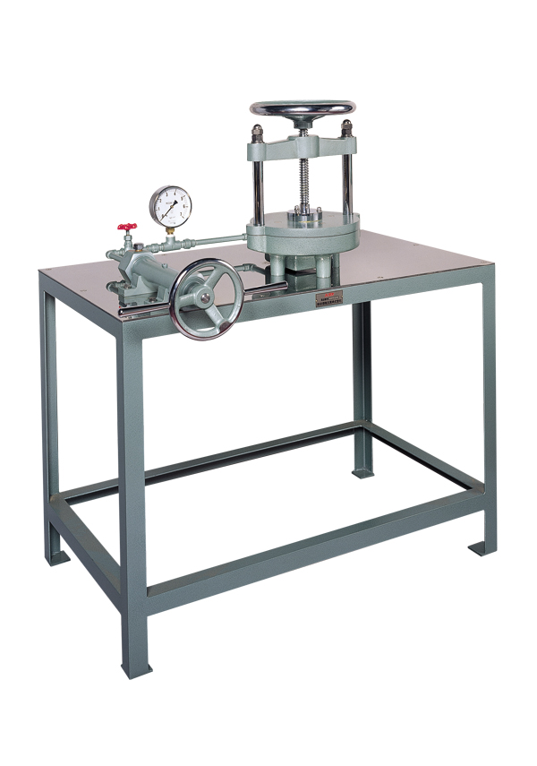 This machine rapidly dewaters the paper sheet after couching, which was made by the sheet machine. Machine configuration: by the movement of the pump piston, glycerin pushes upward the floating pressure plate via the rubber diaphragm in the press, to apply a pressure to the specimen. The upper disc of the press is supported by two columns, facilitating handling of the sheet. This upper disc can be easily moved upward.